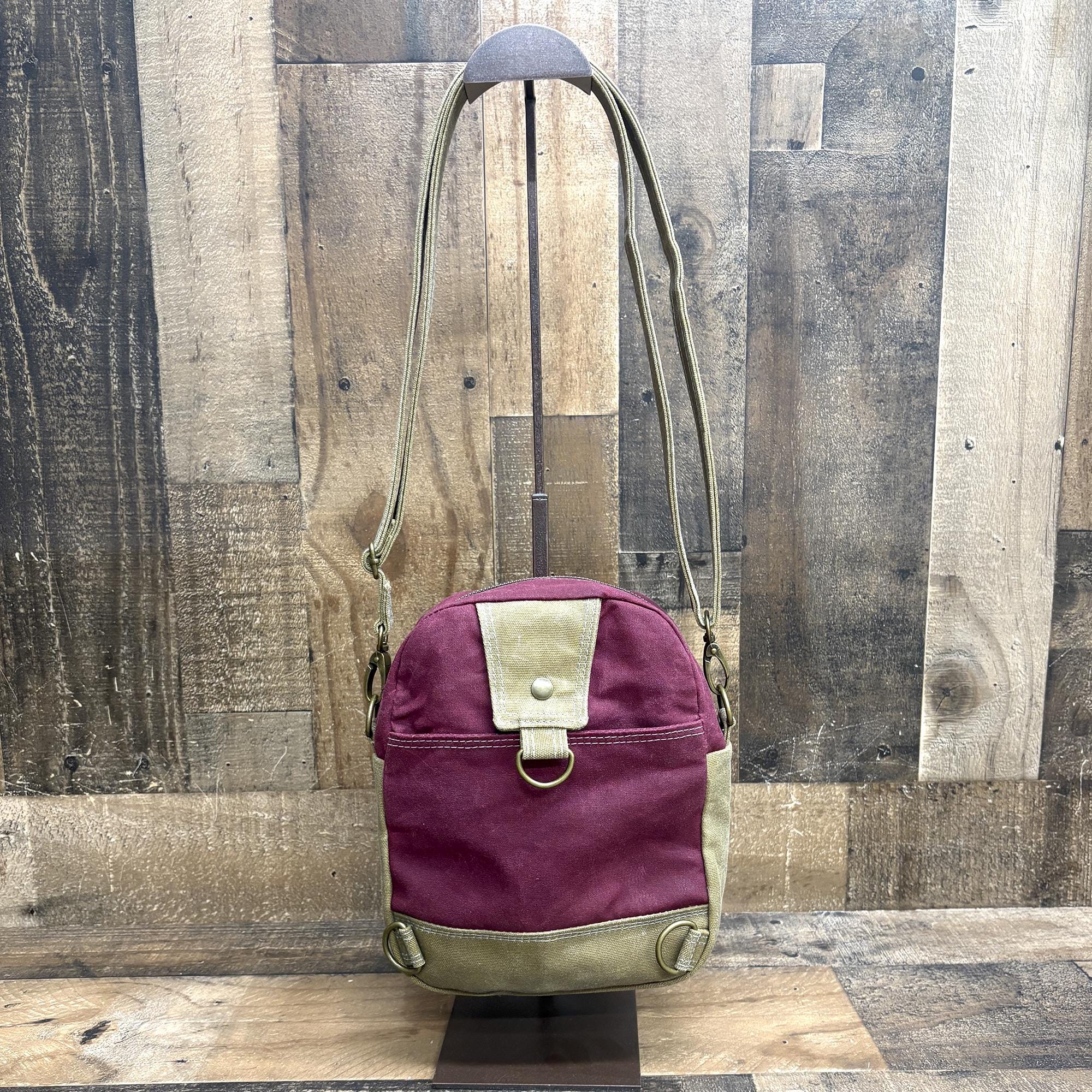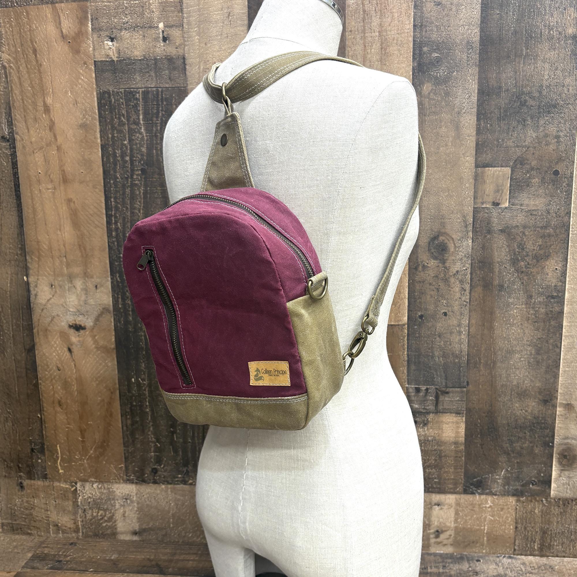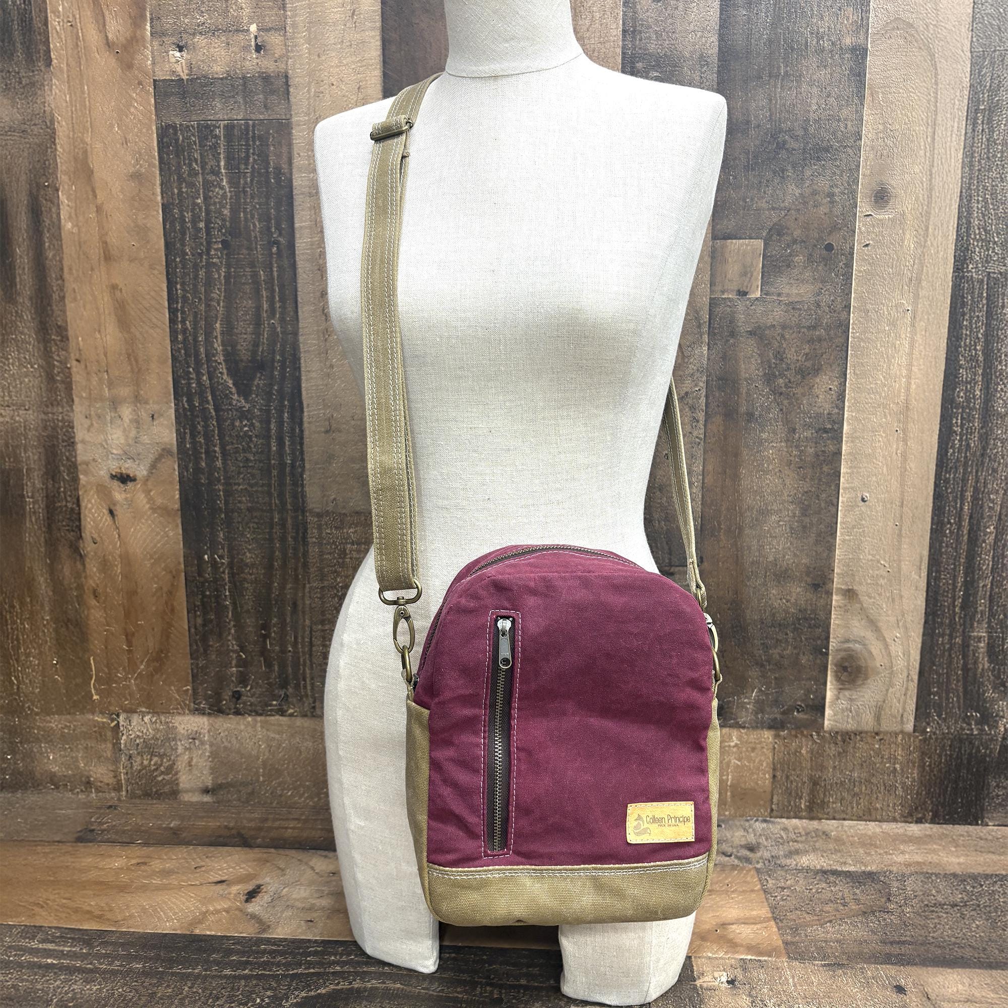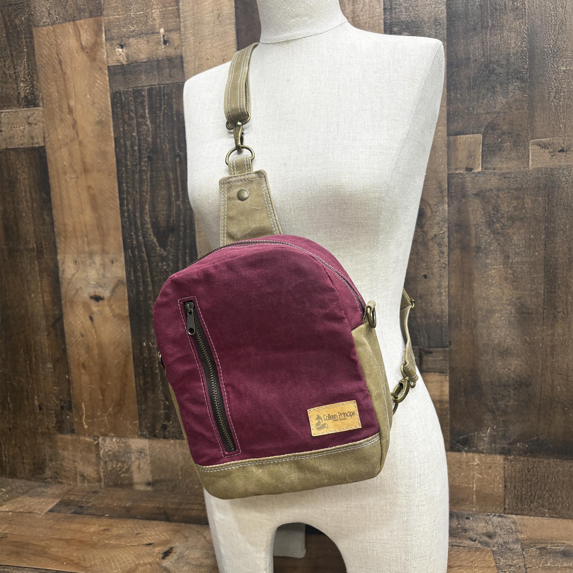 I’ve been wearing this purse around for a few weeks now and I really like it! The pocket on the back is perfect for my phone - it fits securely but it’s easy to access. The inside is spacious and fits a lot of stuff while the bag stays relatively thin. The bag was a little bit stiff at first, but the canvas has softened up with consistent use. I’ve only used it as a sling, so I can’t say much about the backpack or crossbody functionality. I would describe the color in-person as sort of a raspberry. The stitching feels nice and heavy duty - I think this bag will stand up well to everyday wear!