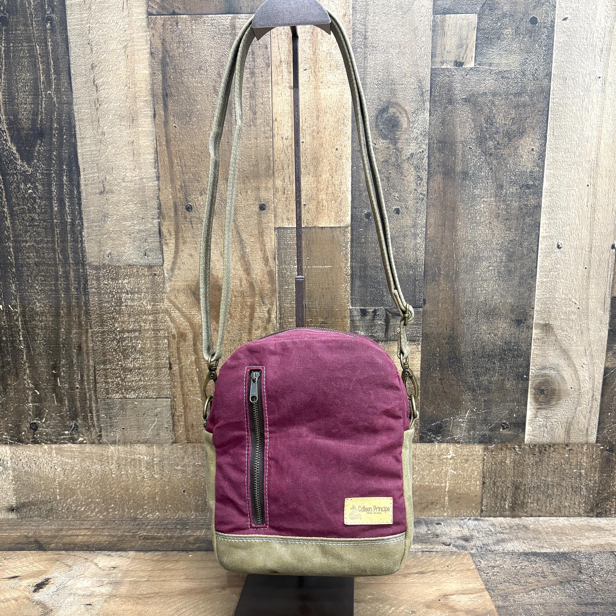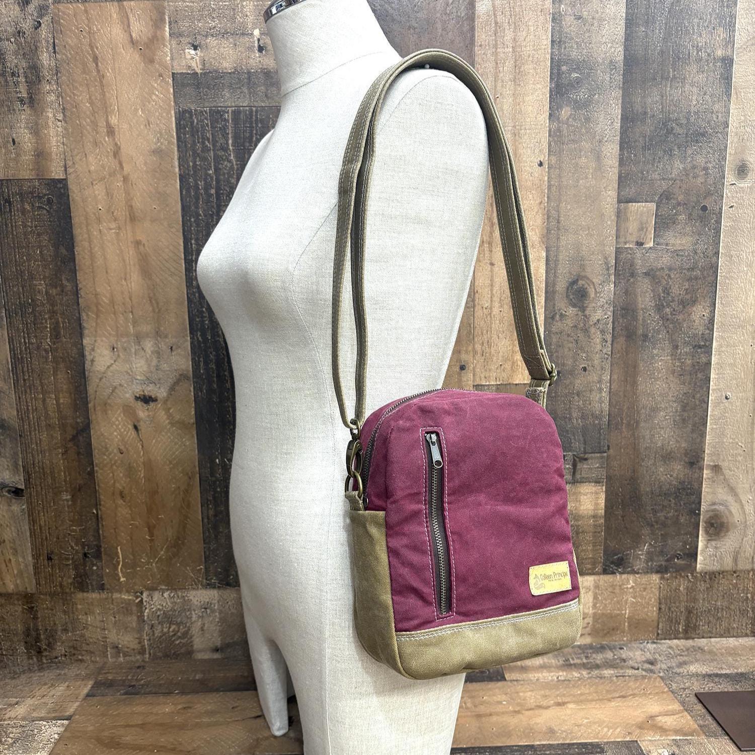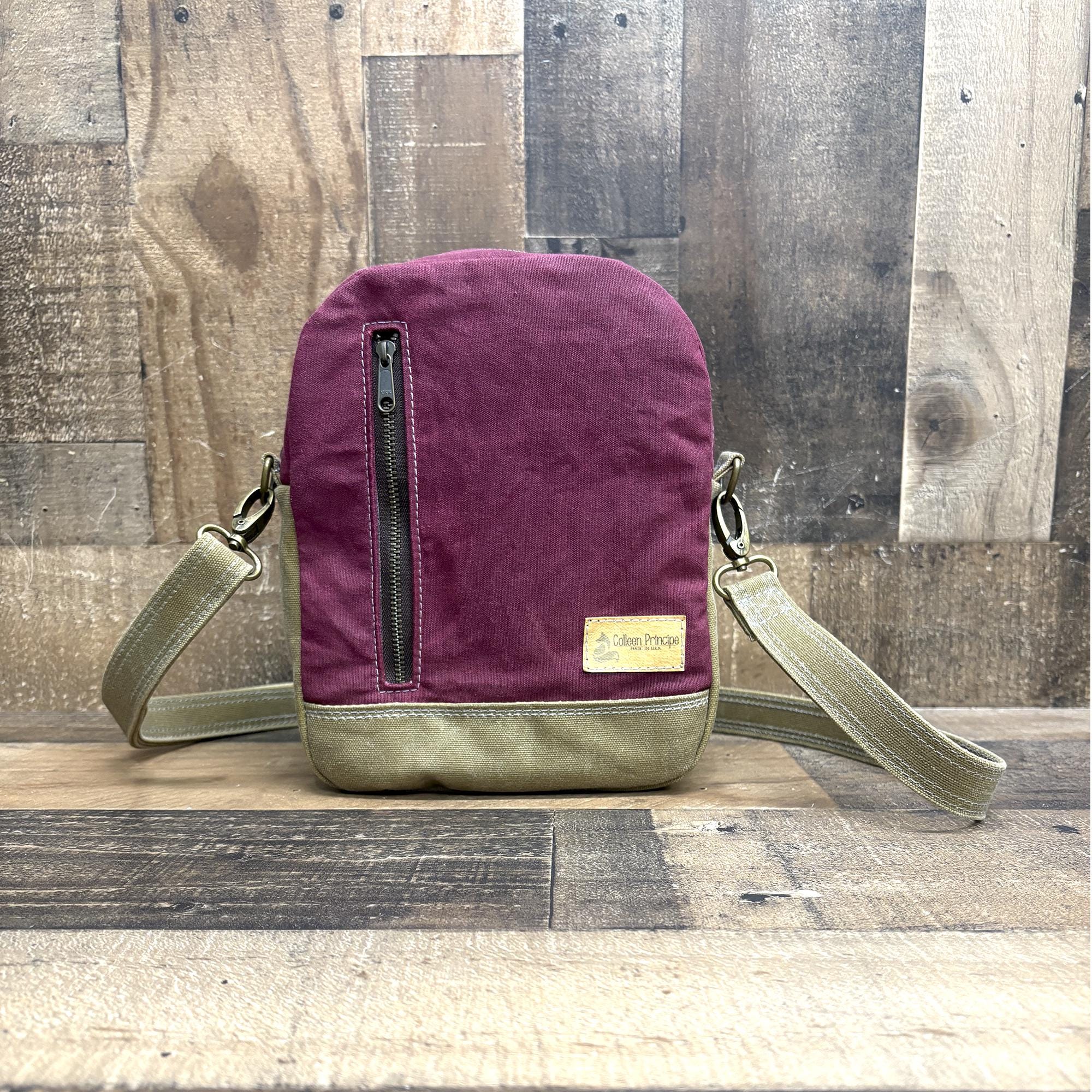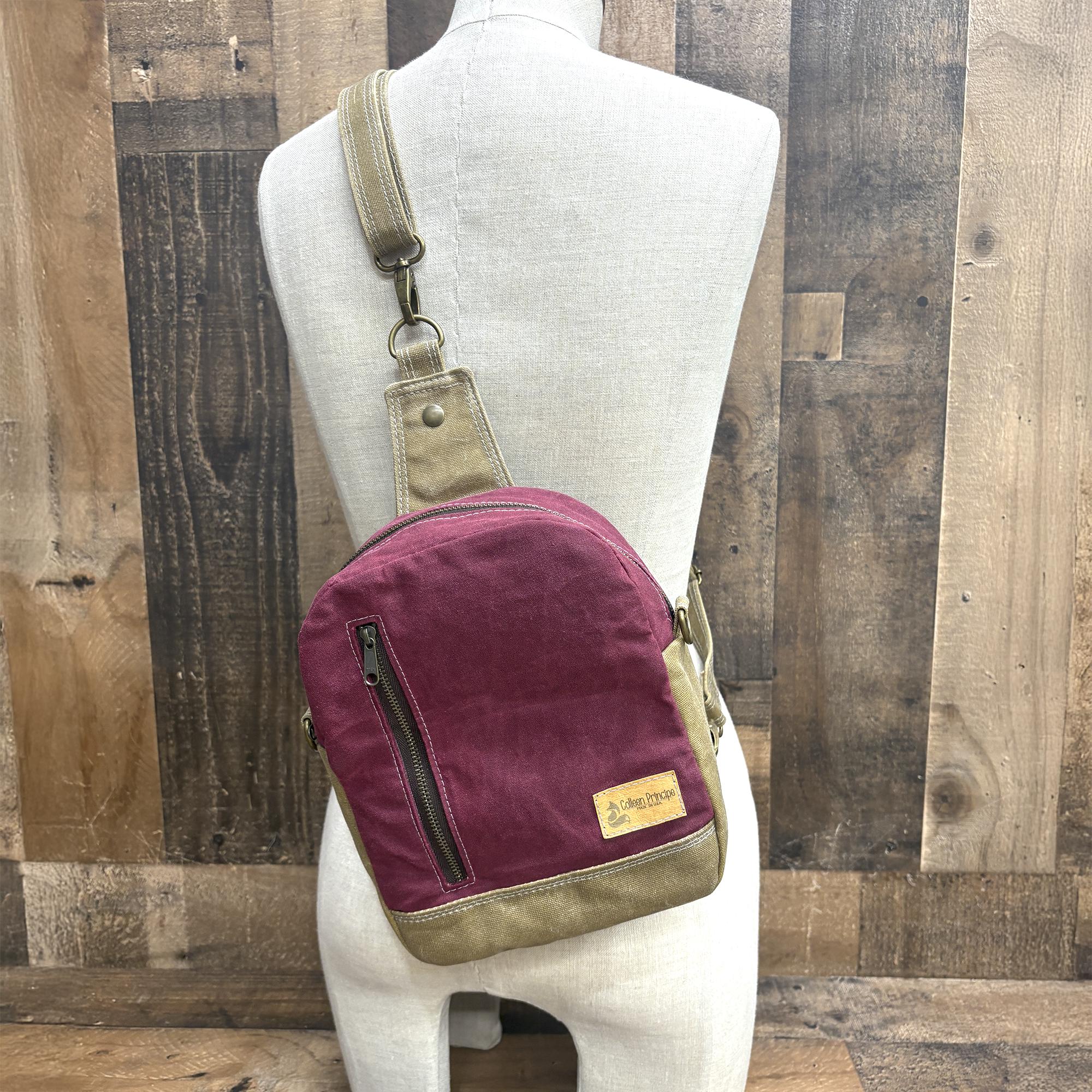 I’ve been wearing this purse around for a few weeks now and I really like it! The pocket on the back is perfect for my phone - it fits securely but it’s easy to access. The inside is spacious and fits a lot of stuff while the bag stays relatively thin. The bag was a little bit stiff at first, but the canvas has softened up with consistent use. I’ve only used it as a sling, so I can’t say much about the backpack or crossbody functionality. I would describe the color in-person as sort of a raspberry. The stitching feels nice and heavy duty - I think this bag will stand up well to everyday wear!