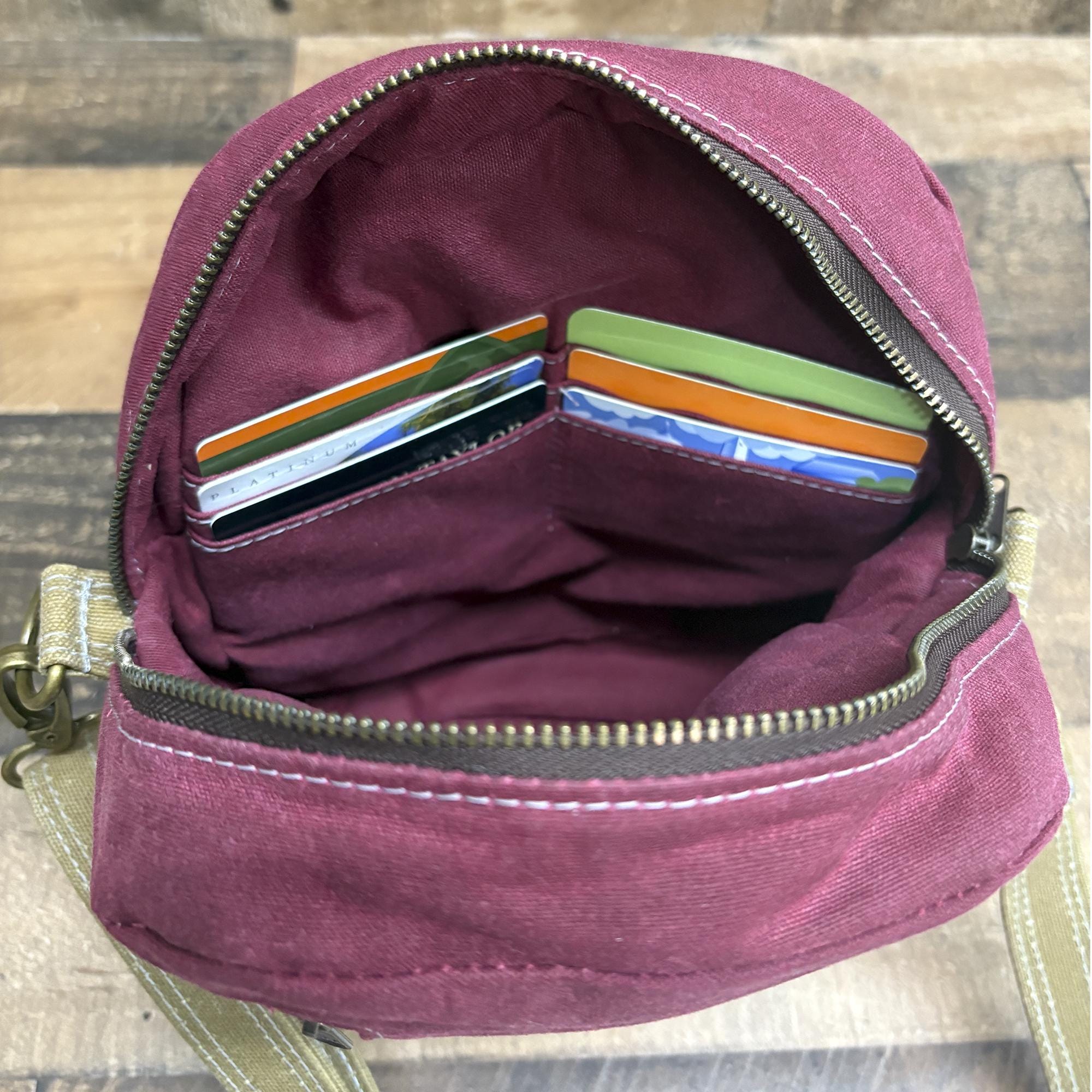 The interior is made with water/stain resistant canvas. Can be made with optional interior zipper and or 6 card slots eliminating the need for a separate wallet.