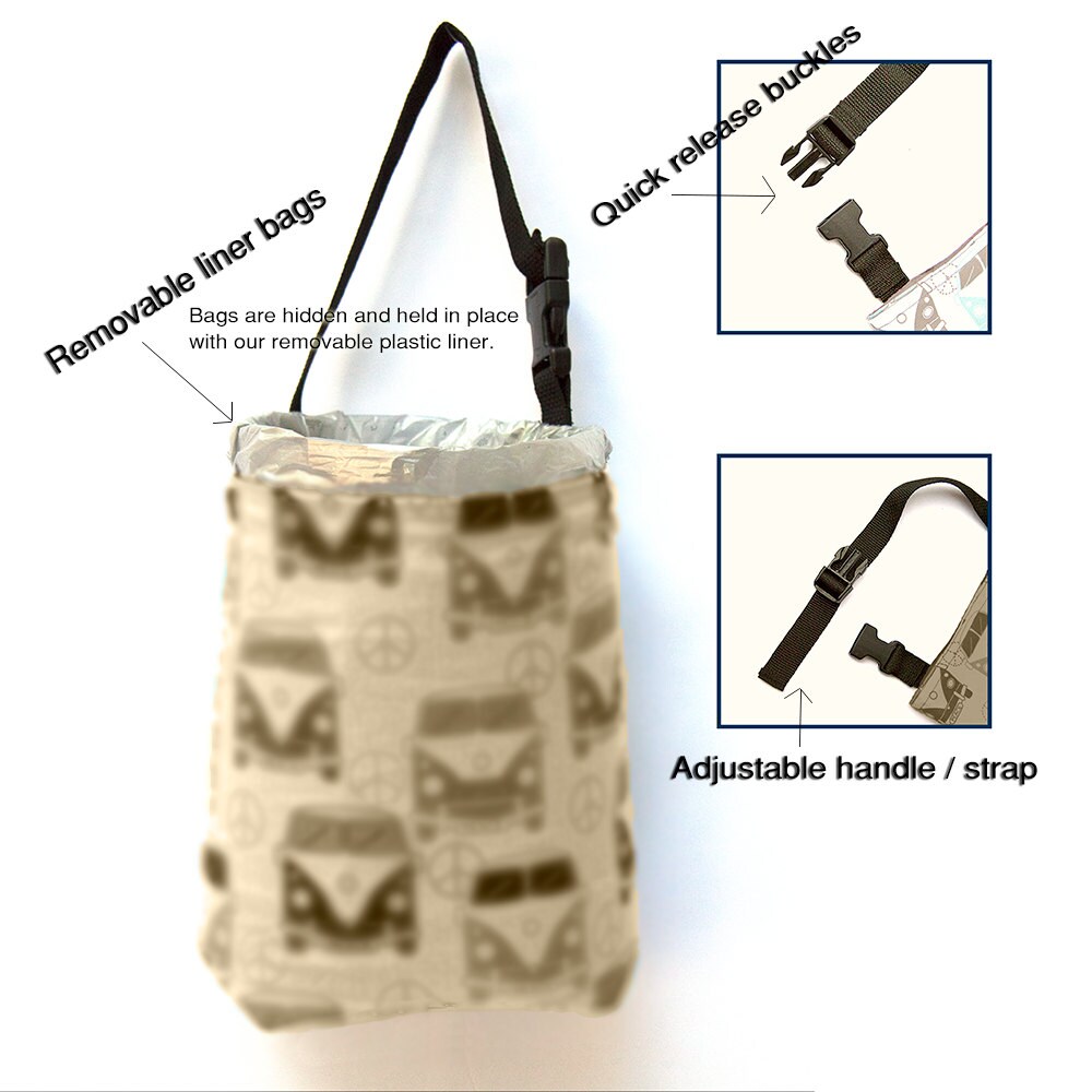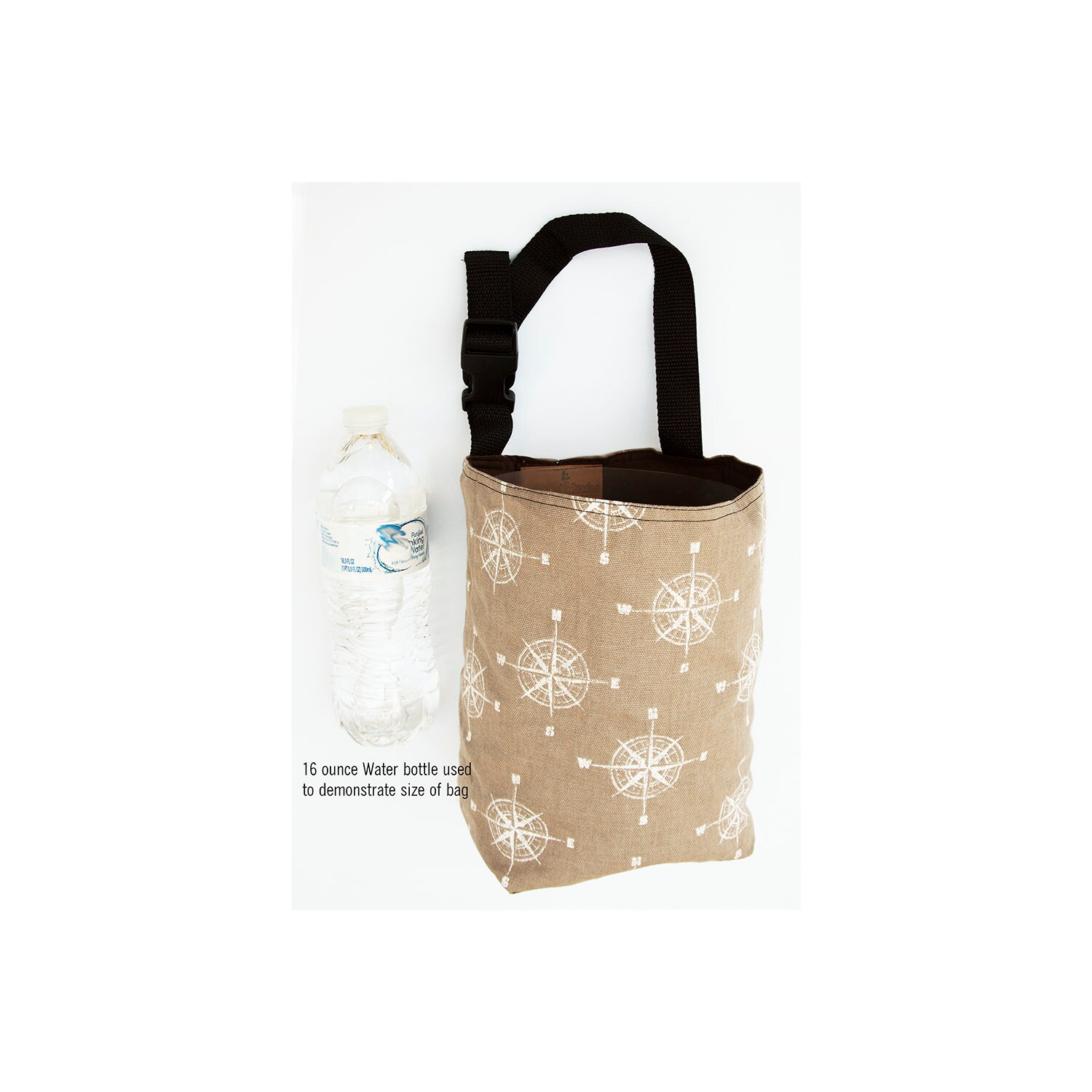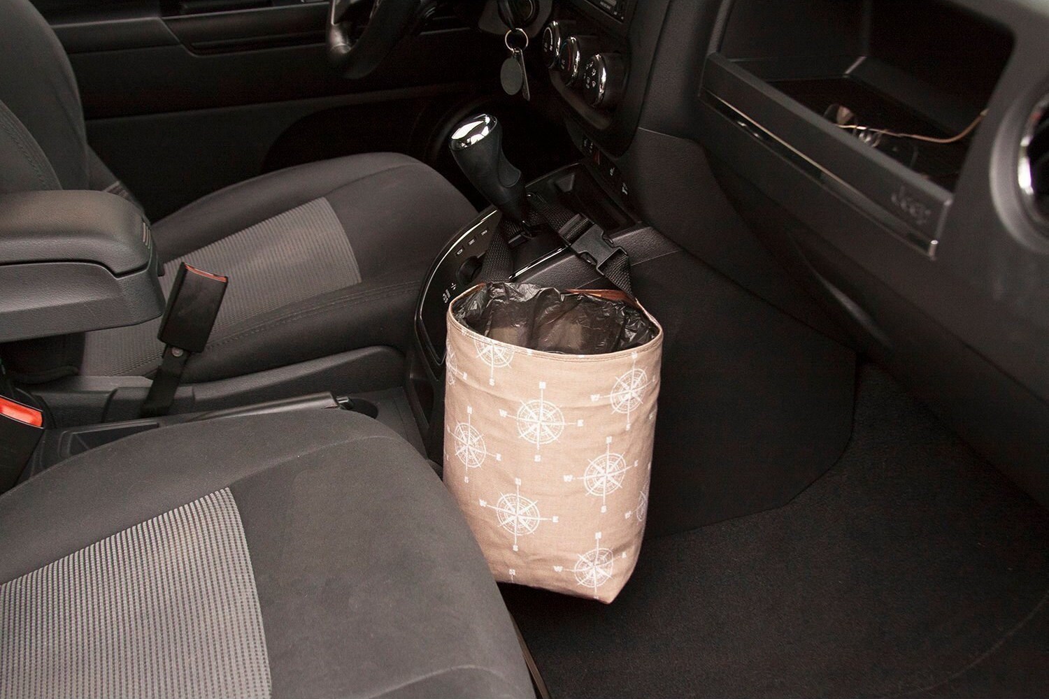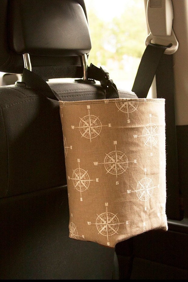 Our Tan Compass Rose Print Auto Trash Bag features a flexible plastic insert to hold disposable liner bags in place so your auto trash bag stays clean and dry.